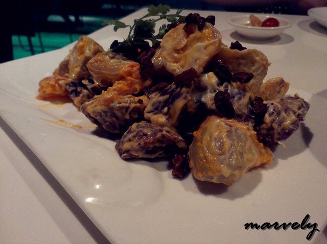 南瓜,紫薯,地瓜的杂粮组合,这三种食材的口感都比较软糯,色拉酱厚厚的包裹这它们。我更喜欢它们有着稍微硬质的口感。可惜撒在色拉上为数不少的核桃仁,大部分都是薅的,甚至有些吃起来是苦的,败笔啊。