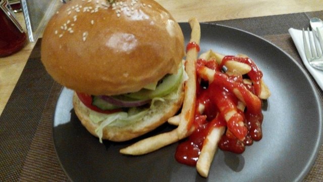 和爸爸来这家店吃汉堡,在来福士4楼,刚开业的一个月可以转发微信到朋友圈1元吃汉堡,排队的人很多,从10点排到11点才能陆陆续续地进去吃。。。真的是疯抢啊~我们去的时候还停电了,推迟到11点半才开始,运气哈差!还看到他们点的几个老板也来了,这里不能自己带水的,只能消费,这点不太合理,我想喝蘑菇汤,可是服务员说没有。。。我也就不点其他了,就2个1块钱的汉堡,后来女老板过来打招呼了,我说有没有白开水,她说要买的,我就无奈了,后来看我们排了很久,就免费送了2瓶进口水,真不错,这里的汉堡味道也很好,量蛮足的,牛肉还有很多汁水,蛮嫩的,再配上薯条,绝对够饱了~~~~