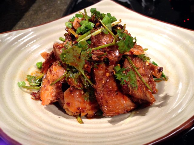 【香辣牛肉】应该是28元,牛肉香而微甜,底下垫的是黄瓜丝,不错的一道凉菜