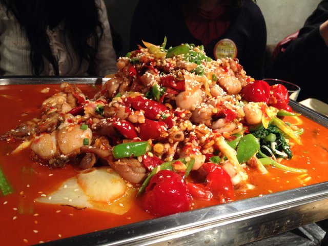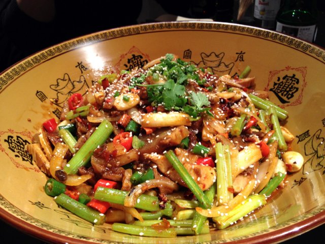 还尝了一道新菜,还没有取名字呢,准备稍后推出。采用了牛筋、牛板筋和牛肚三种食材,加上五椒麻椒、花椒、青红杭椒及辣椒炒至而成。颜色鲜艳、麻香浓郁,反而没有那么辣,味道不错呢~再加几个灯笼椒就有点麻辣香锅的意思了,哈哈~~~