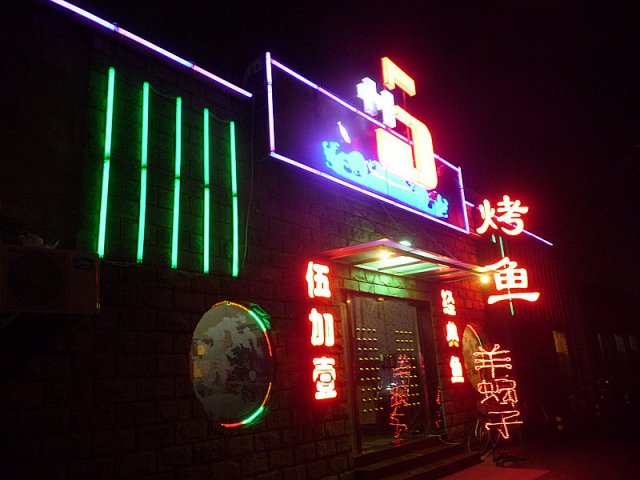 5+1烤鱼吧在酒仙桥公交车站陈各庄的位置,下车就能看到,对面就是乐天玛特大超市,交通上还是很便利的。招牌很醒目,路边的大灯箱还有箭头标注。