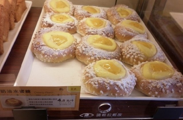 85度C的店子在武汉还比较多,这一家交通很方便,所处的位置人流量很大,所以人气很旺。环境也还不错,很明亮,很干净,柔柔的灯光,尽显店内的舒适温馨,也给玻璃橱柜里面种类繁多的面包洒上了一层华丽的光辉。好喜欢吃他们家的奶油水蜜桃,好香,每次都被它的模样和香味儿吸引。很好吃,口感很细腻,奶油不是特别腻,浓香型的,外层的面包饼比较厚实,但是吃起来是蓬松的,水蜜桃块头儿还挺足的,诱人的放在正中间,真心好吃,价格也不贵,一个不到5块钱,吃的真满足。:)
