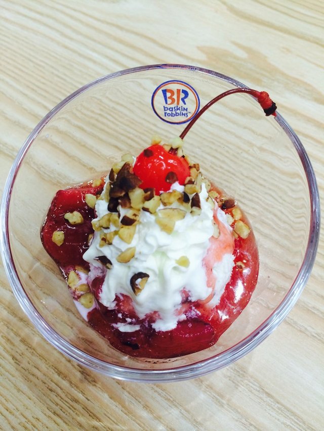 冰激凌球挖的很大很实在,还有草莓酱、芒果酱、焦糖酱等可以选,我选的草莓酱,里面是有很多草莓果肉,混合冰激凌,味道很不错。