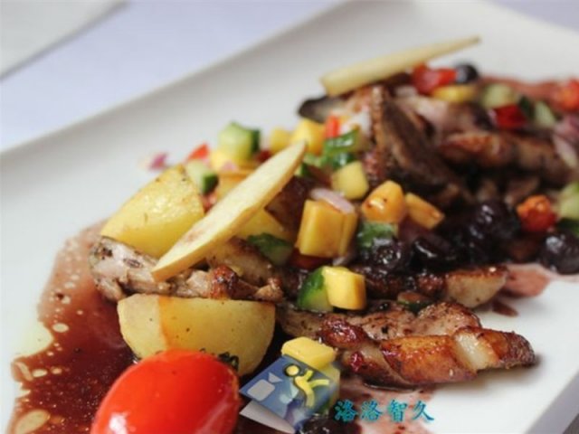 香烤鸭胸伴芒果青苹果及红酒牛骨汁:鸭胸肉还是蛮嫩的,吃口略像牛肉,蛮厚实的口感,而且并没有鸭骚味,还不错~