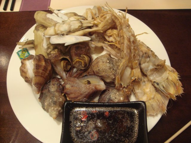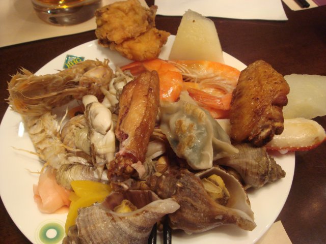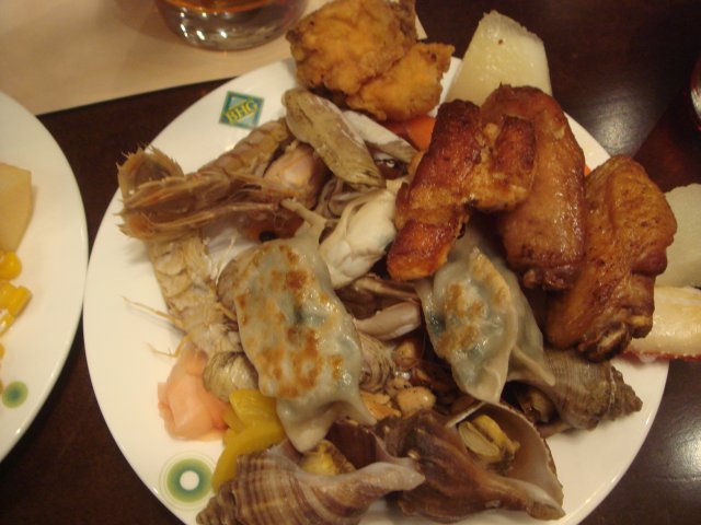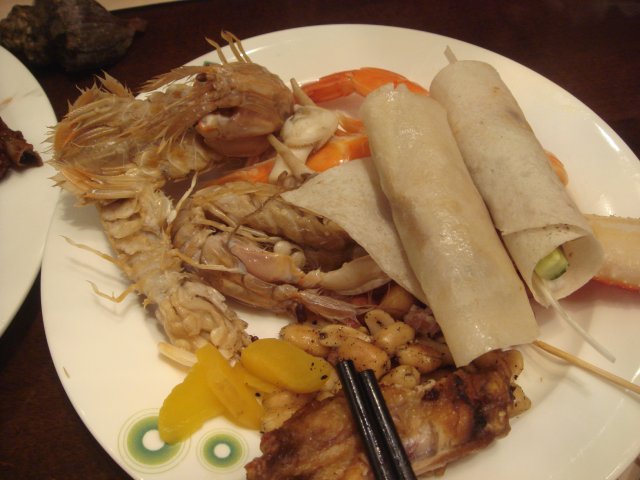 开吃了,自助,简单随意,一人一个小夹子,可以换到一些限量的吃品。诸如虾、蟹棒什么的则是不限量的。在此推荐虾,很好很不错,个头大,蘸醋吃。
