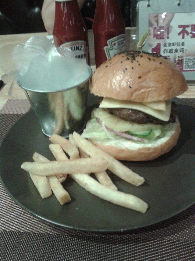 看到微信上的朋友圈,说是一家新店,而且有活动,一直到月底都有1元的汉堡,这么好的事怎么能错过,不过因为不在附近上班,也只有周末有空,天气那么热,有点纠结,不过为了吃的总算礼拜天起个大早去排队了。地方很好找,10点多到的,前面已经排了二十个人了,果然吃货的热情是挡不住的。11点准时进店,需要转发活动要朋友圈,看了菜单,价格蛮贵的,随便一杯饮料就30,我们就没点其他的。大概等了半个小时,汉堡送来了,因为是现做的,时间有点久。汉堡看上去不大,不过料很多,旁边配有薯条,每桌都有番茄酱,这个创意不错。我觉得牛肉不好吃,好老,汉堡的汁水很浓,里面还有一片菠萝,搭配有新意。总的来说,1元肯定是划算的,就是排队时间有点长,原价确实很贵