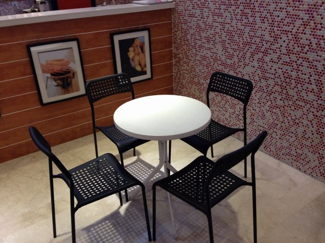 店店的面积真的很小了,摆的座位区域也是小小的两桌。吧台里面也感觉很小,里面放有冰淇淋机的哟。抬头可以看到美丽的图片,可以看图选择的啊!个人感觉是很简单的一家小店的。可能盈嘉下面的人气也是还没有起来的,这里购买东西是不用排队这些的。提供的作为区域也是可以坐的哈!