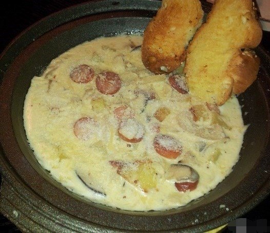 这个好好吃,奶香重,土豆应该有先被煎炸过,又香又粉~蘑菇和火腿切成小块,拌着咸咸的奶油汁,虽然卡路里狂飙,仍忍不住食指大动!