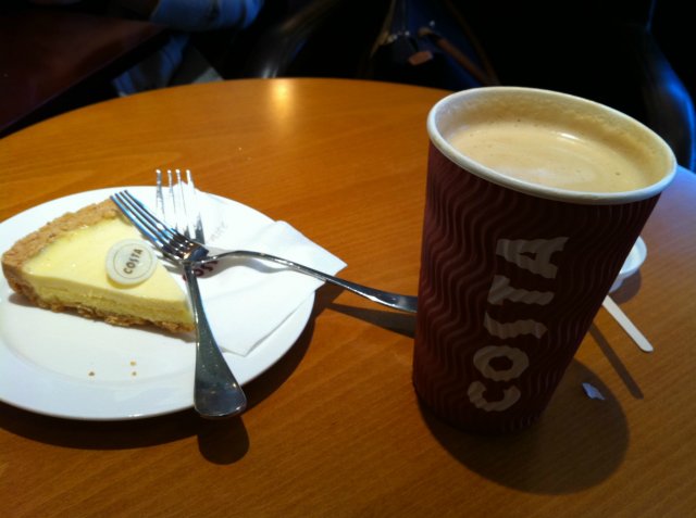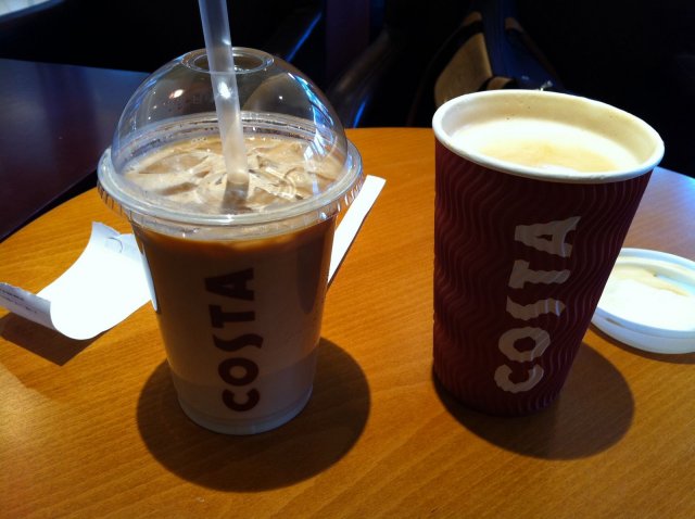 朋友是万年不变之低咖啡因+脱脂奶+少冰的冰拿铁,我的是万年不变之双倍咖啡+脱脂奶的热拿铁,吼吼~其实感觉COSTA的咖啡还是很好喝的,最赞的就是经常和信用卡有活动,中杯买一赠一很是划算