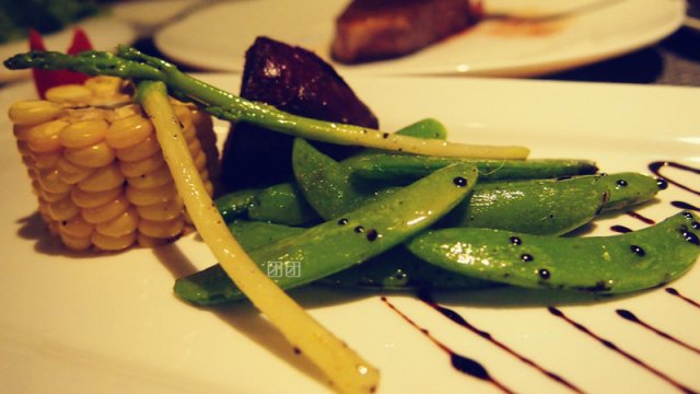 (*^__^*) 嘻嘻……,讲究营养搭配的你看到上面的牛排可能会被吓到,这么一份光秃秃的牛排要怎么吃呀!这不~因为牛排比较大,占用了一大半的盘子,所以店家考虑到切牛排方便各种因素,把美丽的蔬菜们分出来放在另外一个盘子里,让你可以在那个主餐盘里面毫无顾虑大刀阔斧的展现你的切牛排功哦!
