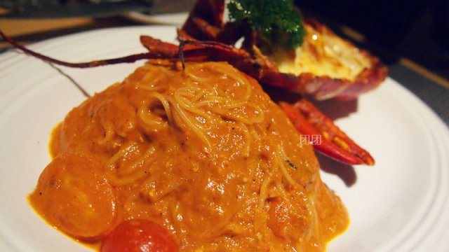 顺应着龙虾浓汤趋势,继而上来的这道【龙虾天使意面】,分量大得惊人,目测一个盘子可以让3~4个闺蜜都一起分享到.这道意面的不同之处相信大家都能看得出来,就是这浓厚又量大的奶浆,纤细有嚼劲的天使发丝裹上这么浓醇的龙虾酱,吃到嘴里之后怎么也不会孤单.活杀的波士顿龙虾经过芝士的焗烤后也会有一股特殊的奶香味道,新鲜到你用叉子去插起来的时候还能肉眼看到它组织的弹性,嚼在口里也是甜甜蜜蜜.