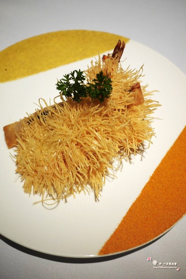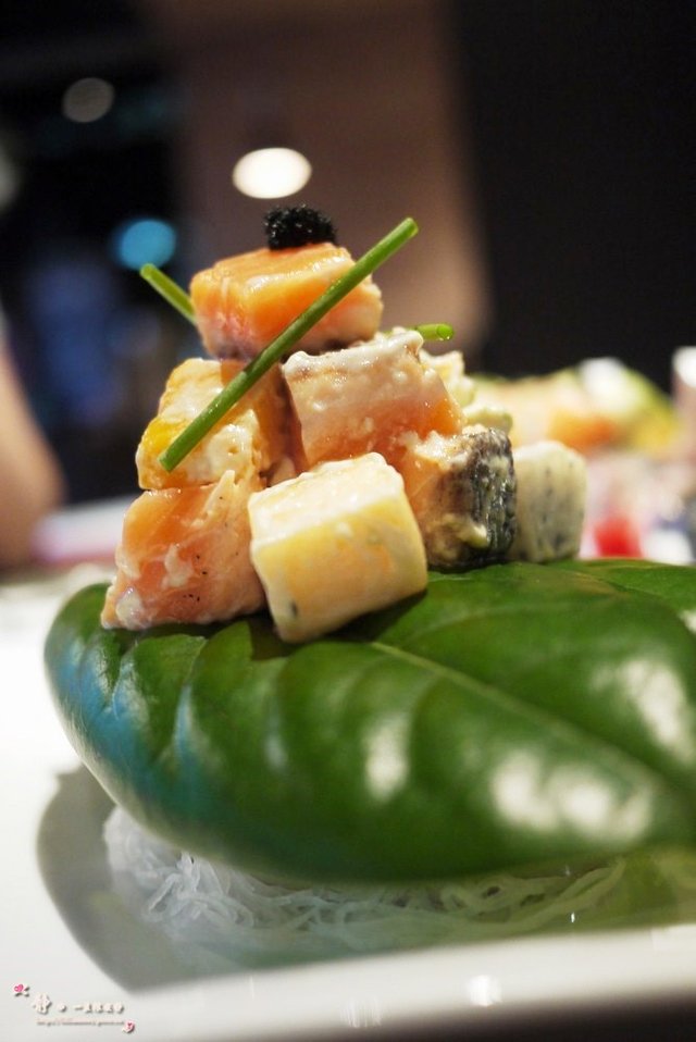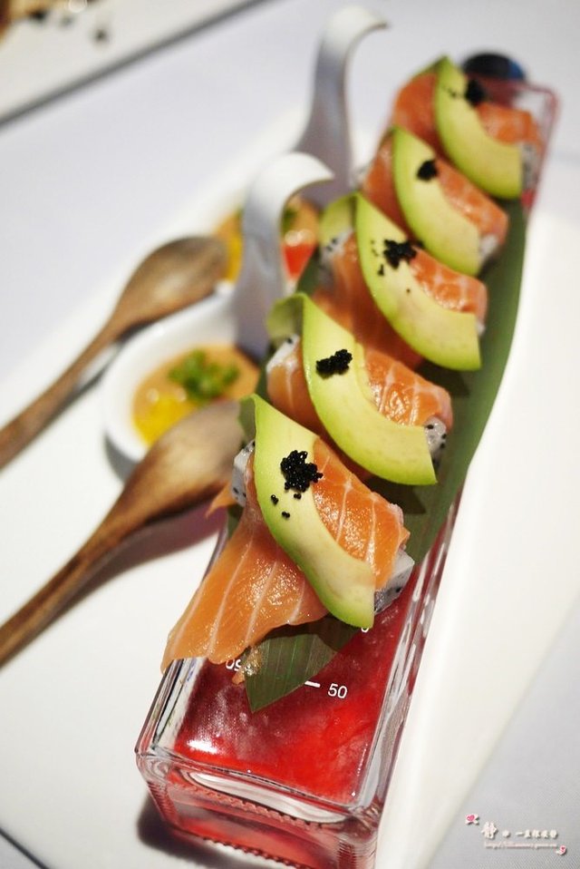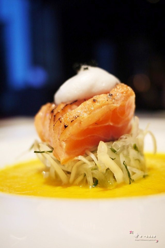 还有一道不知其名,三文鱼片若干,外层略微经过灸烤,所以表皮散发着香味,最特别是它最底层的酱汁,嫩黄的颜色令人神清气爽,味道也别具一格,偶非常喜欢~~