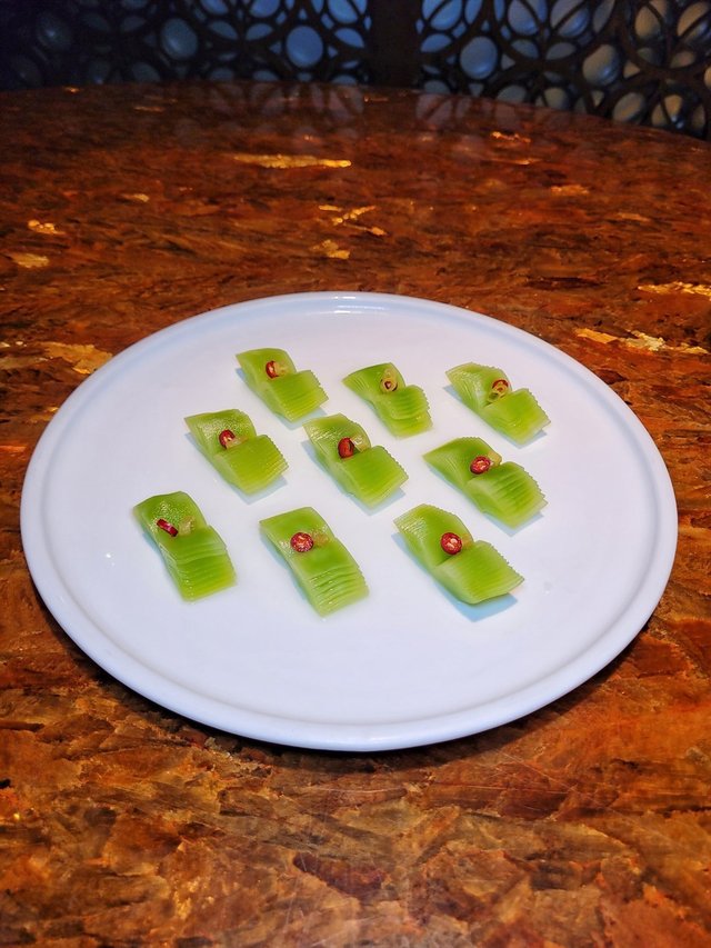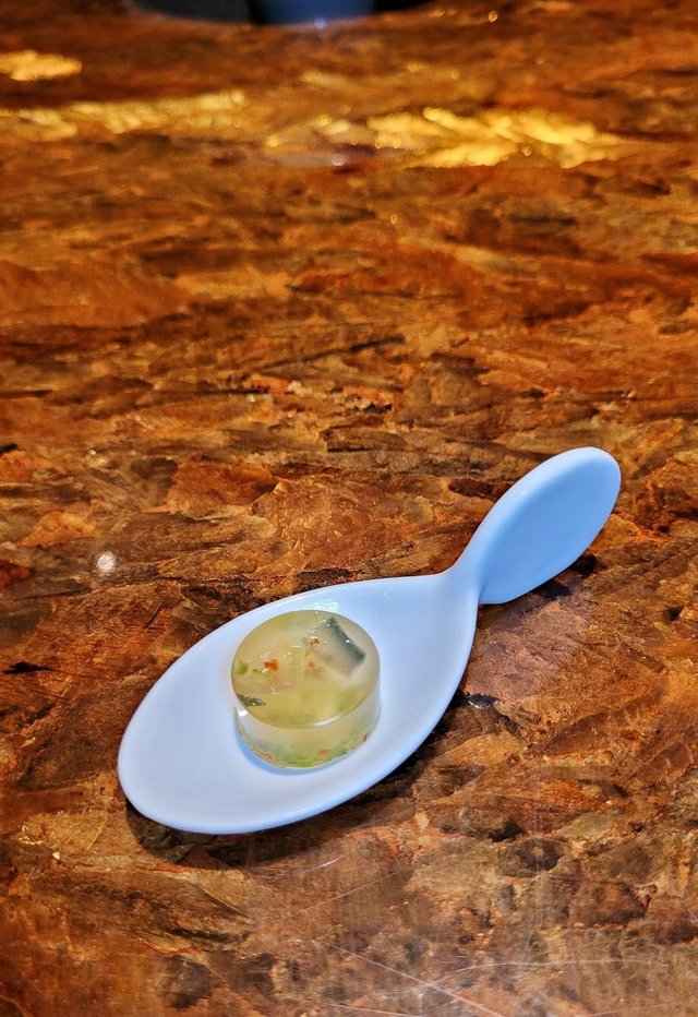 而另一道燒椒皮蛋凍很小巧,晶瑩剔透,入口輕盈的辛香,Q彈的口感,不錯。