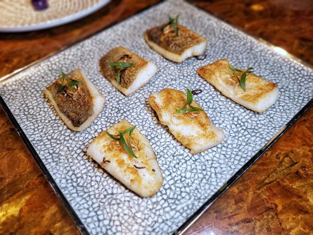 這個葫蘆紅酒鵝肝配迷你蔥油餅是大廚的新作,賣相萌可愛,幾個紫色葫蘆其實是鵝肝,配以同是迷版的蔥油餅,有點絕配的感覺,鵝肝質感細膩絲滑,小小的一件令人不覺膩之餘,蔥油餅的蔥香正好與油香有了提味的作用。