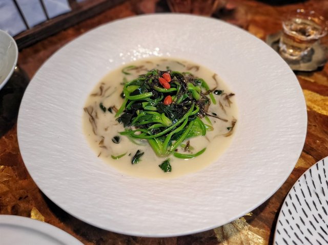 其實已經習慣了每餐飯都有碟菜,餐牌上的濃雞湯浸飛龍菜真的令人搔頭,問過服務員,原來是菠菜,不過浸得好稔,又加入了紫菜,順滑程度更佳,雞湯又鮮甜,好味。