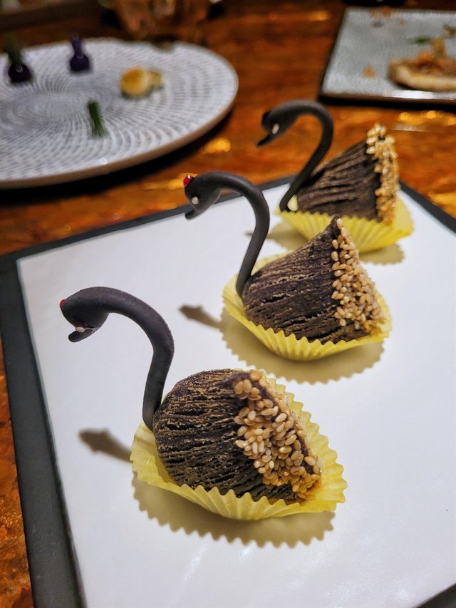 香港好多地方都食到賣相似天鵝的荔芋酥,想不到今次大廚更大膽,黑黝黝的黑天鵝榴槤酥出現,有種破格的氛圍。