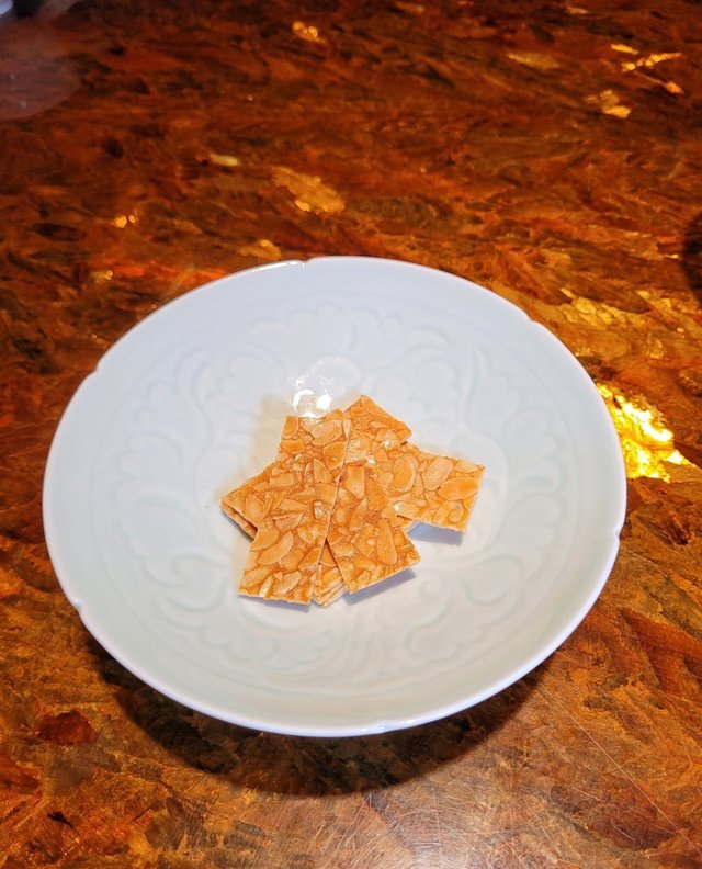 餐前水果是中國出產的藍莓以及杏仁脆片,畢竟是酒店中菜廳,藍莓勁大粒,而且好甜,質素好得沒話說,杏仁脆片亦恰如其分,芳香鬆脆。