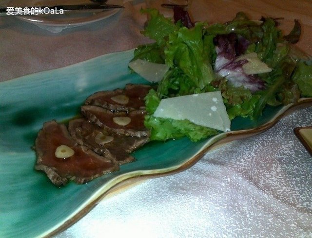 一大堆的菜,片状的芝士和半生的牛肉,菜是用油醋拌的;芝士真心不好吃,很粗;牛肉好吃,很嫩很新鲜的牛肉,超级鲜美~