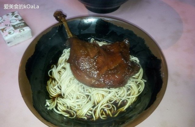 可能是筒子们把那个鸭腿形容得夸张了点,看到实物后觉得有点货不对版,个头哪有很大?比爸爸烧的酱鸭腿要小好不好~鸭肉还算蛮嫩的,但面选的是白汤,所以味道不是很重~但是他们家的细面很好吃,很柔软的面可是一点也不会烂,就算是选择汤面吃得就一点也不烂,赞一个~