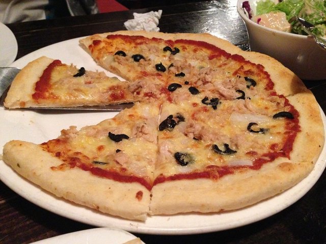 披萨是最后一个上来的,我们要的金枪鱼的披萨,做的不错,芝士放的还挺多的,可以拉丝,口感也很软,量挺大的,我们两个人吃的饱饱的~