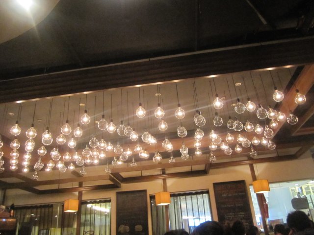 环视一周,顶上的布置也很特别,倒挂的玻璃酒杯,让人产生一种浪漫的感觉。