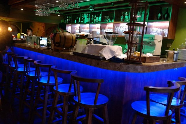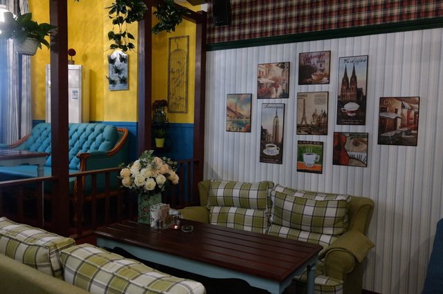 二楼是酒吧风格,也有点儿混搭,靠窗的位置很不错,电视边上的这个大象雕刻板很名贵,是很好的木头雕刻而成,据说是老板从泰国带回来的,屋顶的灯会随着音乐的旋律一闪一闪,很有感觉