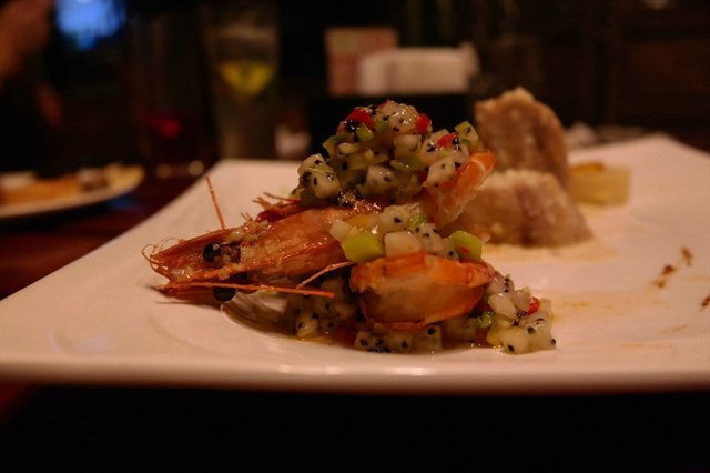 很新鲜的澳带啊,嚼起来鲜甜柔韧,超好吃,海雕卷里面是三文鱼,也很不错,旁边的大虾的配料是青椒和火龙果碎,很奇特的搭配,很特别的口感哦