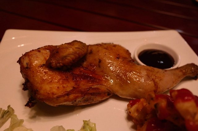 半只鸡直接烤过之后上来的,鸡肉很嫩,旁边的酱是有点儿像肯德基的甜酸酱的感觉,里面混有果香,沾着鸡肉吃还挺好吃,里面还有薯格,我喜欢,越吃越香。