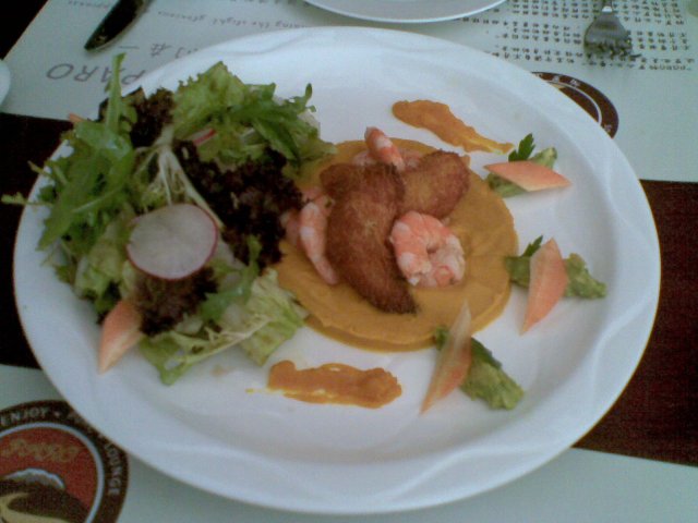 甜虾沙拉底下那层黄色的酱是胡萝卜,真的比较意外,一点胡萝卜味儿都没有,也不知道怎么做的。