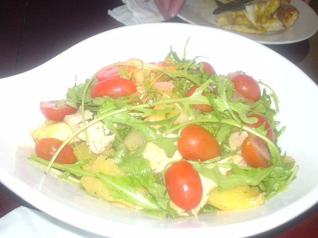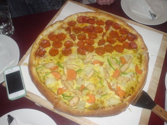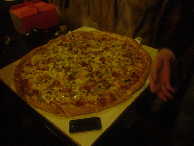 28寸的pizza来了,啊,那是一个大大的圆台面啊。什么情况,其实我终于知道摆在它旁边的苹果手机有多渺小了。那个壮观啊,别桌的客人也都在看着我们的pizza,其实这个可以做双拼,还是不错的,可以多尝尝别的口味呢。味道呢,确实很不错,怪不得老板敢以店名起名,果然有一手。现在外面做pizza的店确实很多,但好吃的真的不多。