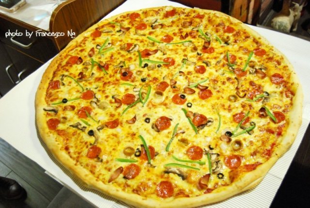 招牌比萨上有洋葱、品蘑、比片、青椒、辣香肠、烟熏泥肠、黑橄榄等,薄底的,但是是双层的,中间还夹杂着一层番茄酱和芝士,所以用料可以说是相当丰富的,味道也非常棒,我们10个人吃这个比萨绝对是足够的,因为女生一小块她们也是吃不掉的,一小块2个女生分也足够的。。。