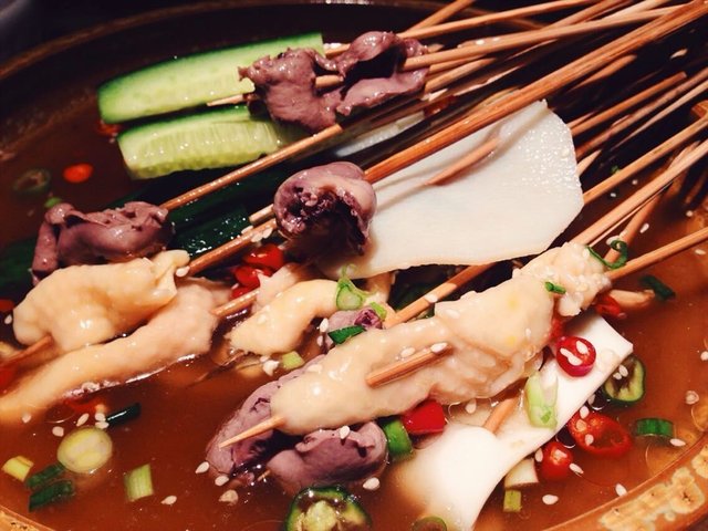 【赞花签签】图片看起很多,其实分量还好,不算多。荤菜有鸡皮、黄喉、毛肚、鸡心、脆皮肠。素菜是黄瓜、土豆片。上面没什么味道,下面却很咸,藤椒味。