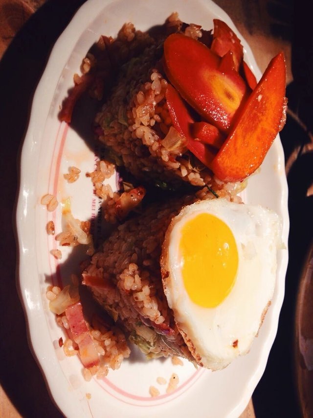 【印尼炒饭】16,做成了两个桃心,有个桃心上面有煎蛋,居然是凉的。炒饭也不是特别热,但是感觉应该是现炒的,里面加了脆锅巴,比较特别,炒饭的味道没有什么特别的,就像回锅肉炒饭的味道。
