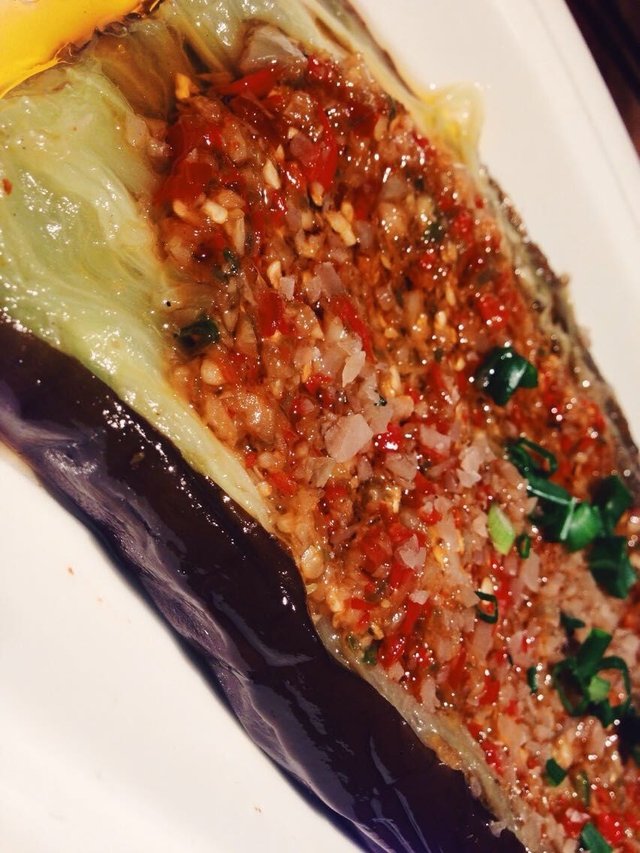 【烤茄子】很辣,第一口就辣肚子,再放点蒜泥会很好吃。