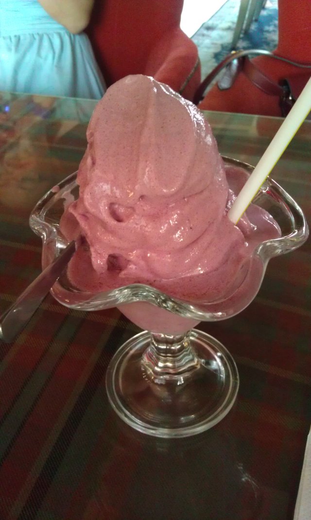 这张本来不想上传的,因为怎么拍都是一坨~哈哈。蓝莓冰沙。服务员给我的时候已经有些化水了,不过酸酸的,还是挺不错的哈。。