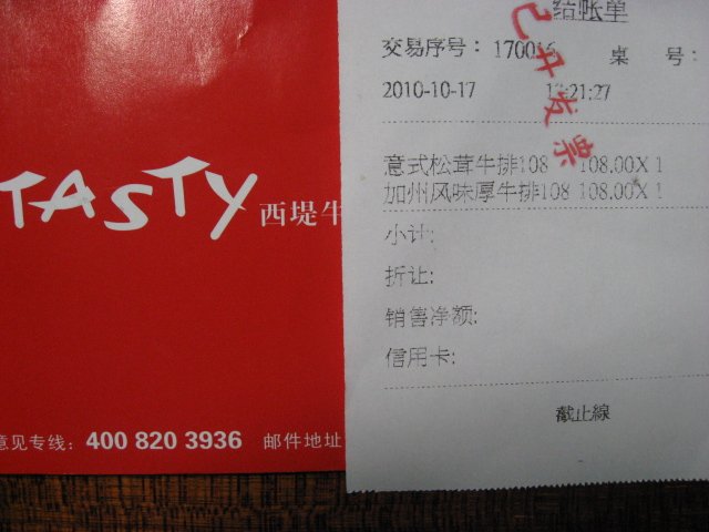 一入到tasty就受warmly welcome,個個員工都好熱情,冇定位,俾人領到角落頭坐,不過都幾舒服,哈哈,個waiter先幫你裝滿個酒杯,不過只系白水。睇佐下餐牌,覺得108個set系最抵,因為今日系weekend,so 冇68提供68rmb個set~