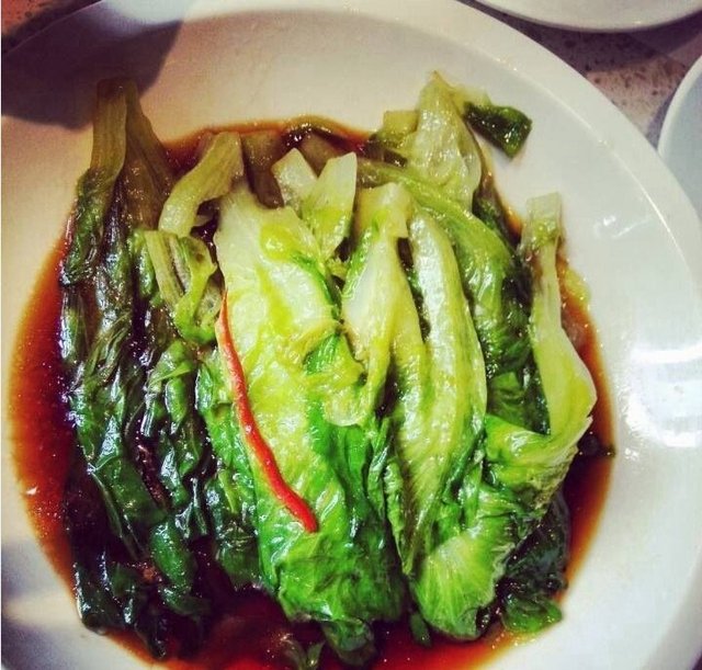 白灼生菜,热水焯熟的生菜最后淋上生抽和热油,生菜还能保持脆爽的口感,蘸点生抽调味,味道还可以。个总觉得这不是广东生菜,味道没有广东本地生菜那种甜嫩。