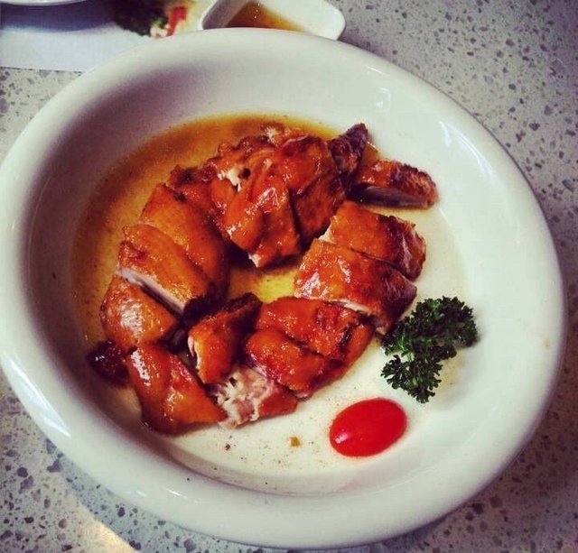 广东脆皮烧鹅,份量中等只有一半,烧鹅皮色绛红富有光泽,皮有点肥里面一层厚厚的油脂,单吃外皮味道还可以,里面的鹅肉肉质紧凑,沾上梅子酱酸酸的开胃,单吃鹅肉味道则一半。