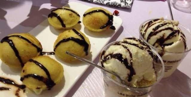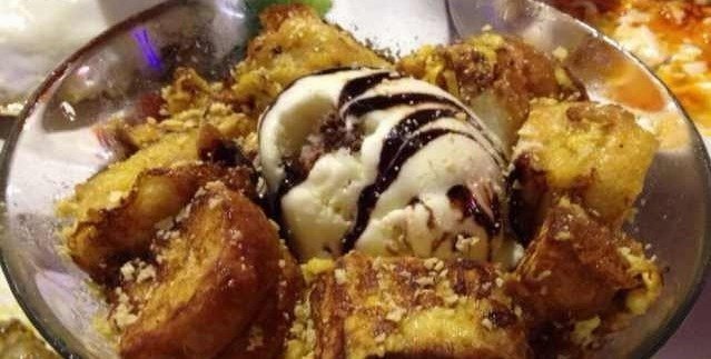 巧克力蛋奶蜜多士:服务员端上来,光是看到有香草冰淇淋、巧克力、蛋奶,就足够吸引我了。在吃的过程中,冰淇淋会慢慢溶化渗入到下面已经切好的一块块的小蛋糕中去,真的很好吃哟。
