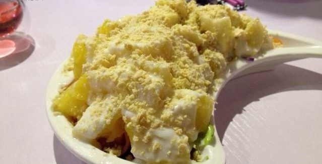 暖暖沙拉:水果的品种有香蕉、菠萝、黄桃等,上面还覆盖了一层酸奶和颗粒细小的配料,味道还不错哦。