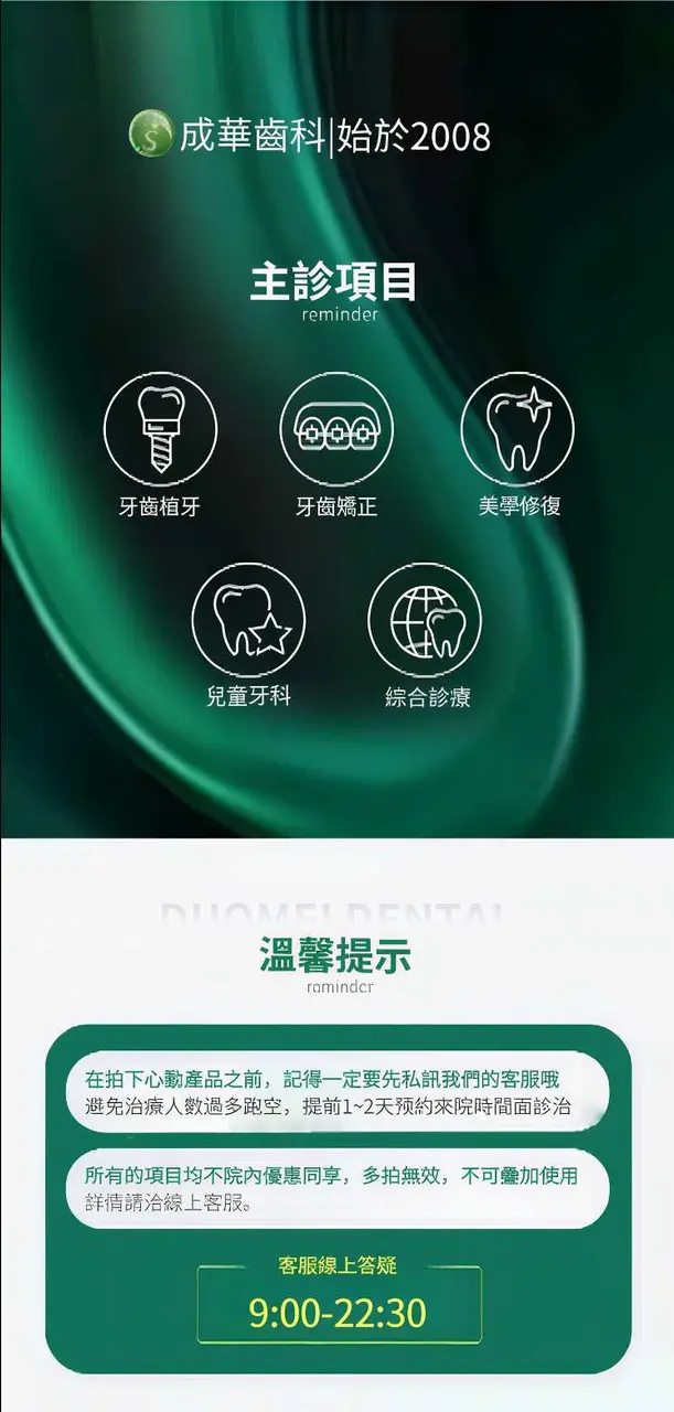 購買後,請點擊【在線諮詢】/【電話聯繫】預約到院時間哦,預約電話:17304435015。感謝您選擇成華齒科!