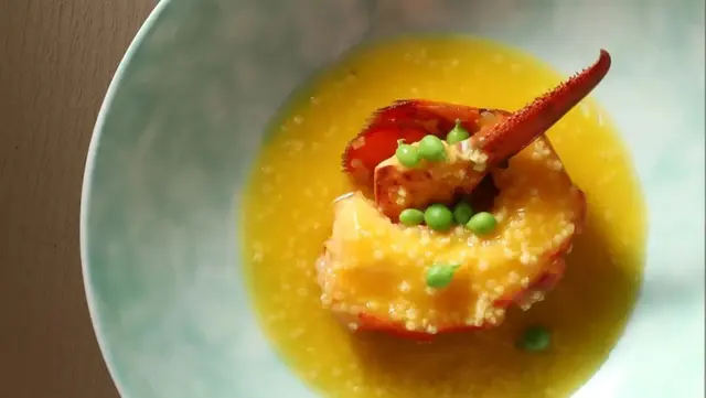 Braised Boston lobster, millet, sweet pea, pumpkin soup