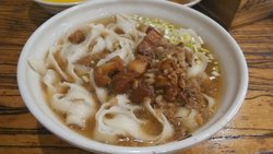 骨汤面6元,卤肉面9元,区别就在几块卤肉上,面片不大,比较厚,口感有些筋道,汤汁味道很浓,味道很好喝,油份很大,卤肉肥肉居多,但口味不是很腻人,卤香味十足。店内装修很有古代武侠的风格,还有免费的酸梅汤和橙汁,不过都是冲兑的,味道比较淡,糖份放的很多。…查看更多