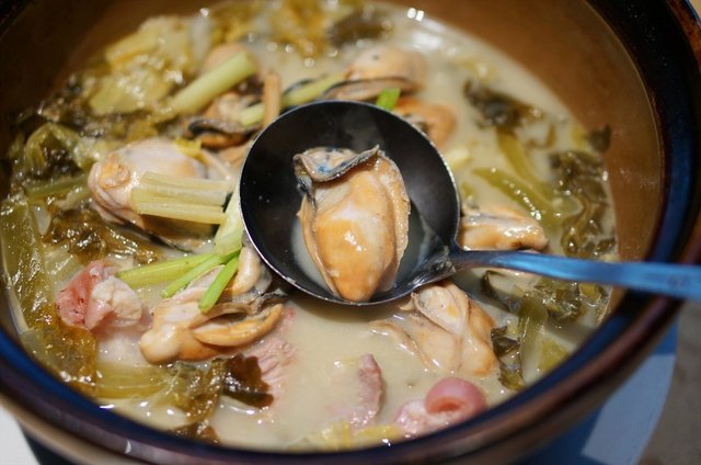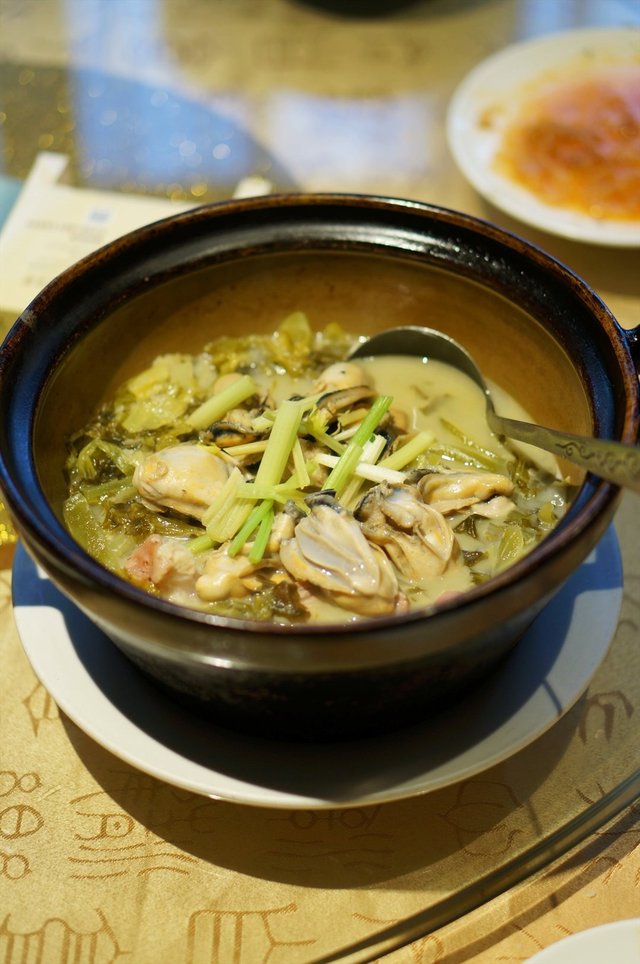 大堂和包厢都坐过,服务挺不错,服务员都很积极主动,所以在这里聚会是件挺舒服的事。大部分的菜还是挺不错的。卤水鹅肝让人印象深刻,超凡嫩滑柔软,且中式卤水调味秒杀法式鹅肝的味道。吊桶炒通菜,通菜很嫩,口感清脆,咸吊桶仔的加入更增添了咸鲜的味道,让一盘炒青菜变得味道丰富起来。酸菜和五花肉煮的蚝,有种酸菜的发酵香和蚝的腥香的融合。这个是比较受欢迎的。当然,所有的蚝都很受欢迎。石窝金蒜蚝,是我觉得最最好吃的,上桌时肥嫩嫩的白蚝在石窝里滋滋作响,金黄的蒜碎香味随热气四处飘散,忍不住马上夹一块塞进嘴里,大火已经把蚝的外表煎到嚼劲十足,但咬开后还能“啵”一下爆出鲜汁,之后满口是肥蚝柔柔嫩嫩的口感。看似平淡,味道却一点不平淡的“芥末炒蚝”,从名字里听出劲爆没有?真好吃,没想到芥末炒也这么精彩。潮州式的蚝仔粥,用的是比较清的粥,生滚入蚝仔,蚝仔的香味融入了粥底之中。不足之处是粥底不够绵密。干锅金蚝就不如鲜蚝迷人了,金蚝就是晒干的蚝,可是太咸太干太硬了,印象中,以前吃过一种半干的金蚝,口感和香味要比这种完全干的蚝干要美味。墨鱼汁加在肉碎里做的蒸肉饼,也是略咸,但是肉饼和墨鱼汁一结合,就鲜美无比了。其他的菜,比如杂鱼煲、浓汤烧鱼丸等,也都有不错的水准。另外上汤青菜也算是这儿的亮点了,据说都是乡下来的很土的青菜,吃起来非常有菜味。上汤里还有细细条类似鱼丸的东西,应该是用鱼蓉做的,所以上汤很浓醇,又给增添了青菜浓厚的香味。唯一不想再试的是苦瓜煲,还是服务员推荐的,结果苦瓜是没有去籽的,口感不算很好,而且……苦瓜白煮这样清淡的做法,真是接受不来。如果吃蚝的话价格很贵,没有会员价的话更贵,可能与生蚝品质要求比较高有关。可以办会员卡,但是要第二次才能使用。生蚝之外的普通菜价格普通,不算便宜但出品衬得起价格。值得一试。…查看更多