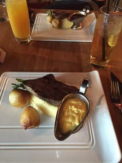 高峰美式牛排馆这家店是小伙伴请客的时候光顾的,这家店开在城市酒店内,这里环境很不错。朋友给点的牛排看着有点干干的,但是入口特别的嫩滑,搭配上店家自己做的酱汁后味道更特别。…查看更多