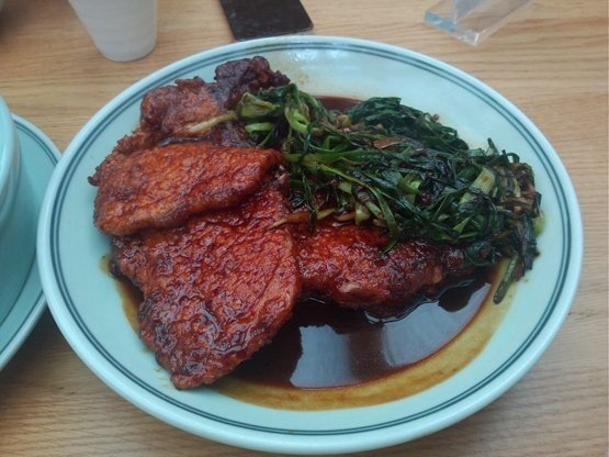 农家菜店他家吃的是家常菜,环境很干净的,我和同事最近经常光顾的,点了一份葱烤大排,排骨很大,厚薄适中,很入味的,色相就很好,葱超级多,点睛之笔,很香哦,搭配白米饭很好吃的…查看更多