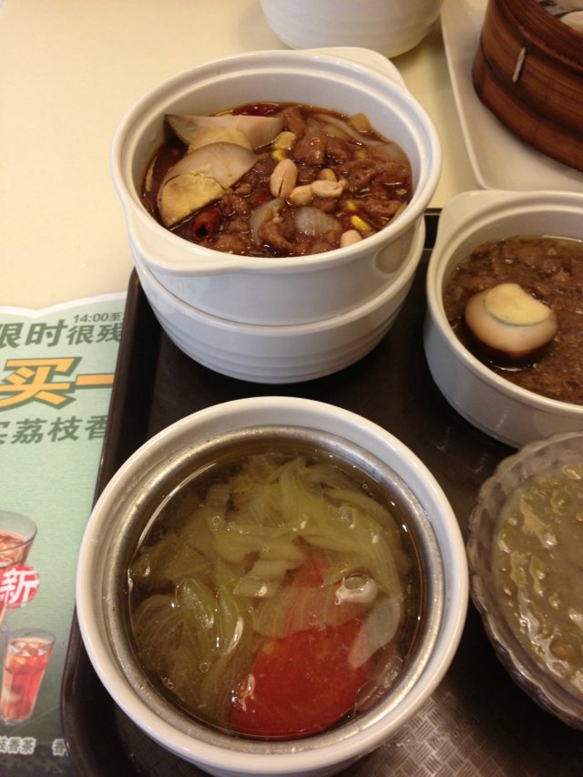 国庆有朋友来深圳玩就住在七天,所以每天早上过去汇合都是去这里吃早餐。朋友喜欢这里的冰豆浆。以前早餐经常外带,所以也都吃过。这里套餐还是之前那些没有什么革新。宫保鸡丁,卤肉饭,起码有4年历史了。梅菜扣肉,三杯鸡看着还能新鲜点,后者味道真不是很地道。肥牛和鸭丝豆干,肥牛就口味一般,鸭丝更差。我就发现怎么所有的套餐都是一个汤呢,一连喝了几天都是酸菜鸭肉汤,没有吃出鸭的味道,酸菜那真是酸,还放了番茄。云吞比以前分量还少了,才6,7个粒。小笼包味道也挺一般的。前台极力推荐的烤鸡翅,迷你版,不太好吃。豆浆油条还是保留原汁原味。…查看更多