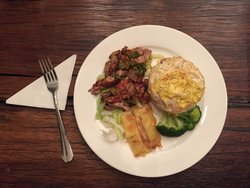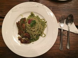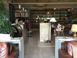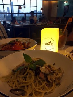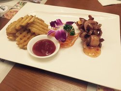 【和小伙伴溜达探食】.无意中发现的店铺,竟然是前一晚跟Junjun讨论mark的商户..猿粪阿~门面比较隐蔽。内部装修很舒适。欧式风格,带着休闲感的商务疯格调。皮具家私。特别适合品酒&小型聚会~有个小包厢,聚餐开会什么的都很适合。主要还是营业红酒&官燕为主吧。菜牌上菜单不多,询问店员得到的答复是,厨师出品都是自创菜色。午市菜单的价格跟团购价格是一样的。#海鲜意粉#好多芝士粉。意粉稍干,but口感可以。搭配着鱿鱼虾等等海鲜必备..#蒜香切片面包#真的很mini的块。面包烤得太干。是为了更加脆脆感吗?~上面搭配着好多蒜香~棒!#蔬菜沙拉#分量不大,还可以吧。里面的坚果类感觉不是很新鲜,#披萨#(店员强烈推荐的)小伙伴不吃肉,跟服务员咨询了下。帮我们跟厨师协调,一半pizza下肉,一半不下。等了40min才上来,之前还跟我们说20min能上到。忧伤~没有吃到很惊喜。感觉还好而已。整体觉得挺有味道的。有机会还想晚上过来探探不一样的感觉~、…查看更多