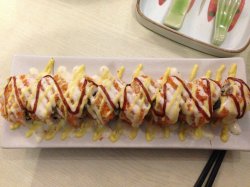 这家店是团购发现的团了一个寿司拼盒 就索性过来吃饭了这家店很小 在乐宾后边马路 倒是很好找 主要是外卖 店里也能坐 有四张四人桌环境很棒菜单就一张纸 反正两面的 上面有店家推荐有个榴莲卷~~~犹豫了一下没敢点~~口味太重了主食的乌冬面有两种口味(酱油和咖喱的)前面玻璃后是厨房~玻璃上贴满了宫崎骏动画调料瓶很有意思~芥末和酱油 味道都不大~这是单点的寿司~他家寿司都是单个 不是一对的卖 摆盘很漂亮值得一提的是米饭 很入味 白醋很足~加州卷 36块钱酱料十足啊 一层沙拉酱 一层蛋黄酱 还有少许番茄酱 很棒的酱料卷子里好多蟹肉 卷的很紧更难得的是卷子上的鱼籽 粒粒饱满 圆润晶莹 值得推荐的一道美味