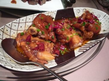 巴蜀猪手: 似乎MM们都有点顾忌,酒过三巡之后居然还剩下整整半只猪手完整在留在 碟中,经过征询一圈之后,我拿出一副“吞灭此手,舍我其谁?”的大无畏 的姿态把它结结实实收入腹中——肉滑爽口,却是多一分太肥,少一分太 瘦,弹牙、入味,几乎要怀疑这只猪是否之前每晚睡前都喝过一小杯红酒, 一级的棒!